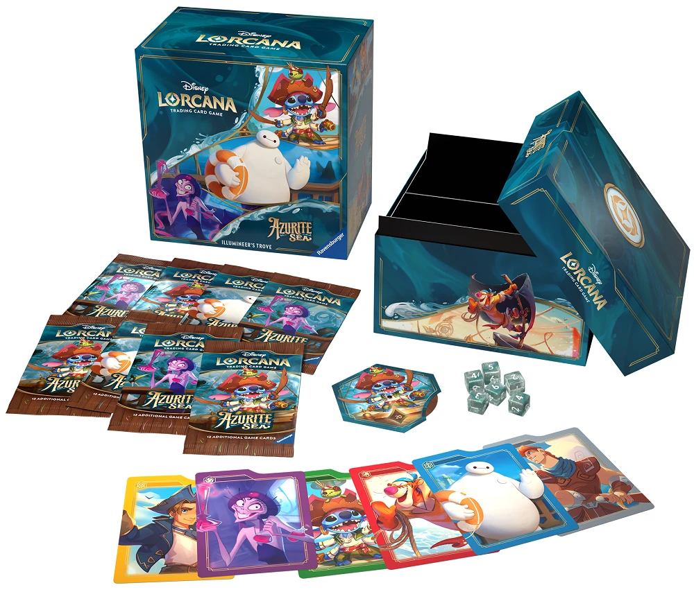 Stuffed with pirate-worthy bounty, this beautiful storage box contains 8 Azurite Sea booster packs, a lore counter, and 6 card dividers. While X marks the spot, the 6 glistening dice will mark the damage on your glimmers.